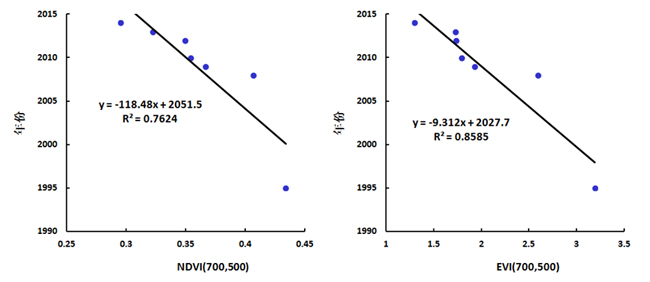 圖 9 NDVI、EVI與其相對應(yīng)年份的散點圖