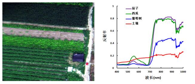 圖3為8月7日天氣為晴,利用無人機(jī)獲取的近地面200 m高度的高光譜圖像及不同作物與土壤的光譜反射率曲線。從圖中可知,土壤的光譜曲線與三種作物的光譜曲線差異顯著,在400-515 nm和580 - 690 nm范圍內(nèi),土壤的光譜反射率高于三種作物的光譜反射率。在可見光區(qū)域,茄子苗、西瓜苗、葡萄樹三種作物的光譜反射率差異也較為顯著,其中西瓜苗的光譜反射率最高,其次是茄子苗,最后是葡萄樹;在近紅外區(qū)域,西瓜苗和茄子苗的光譜反射率十分相近,總體而言,茄子苗的光譜反射率最高,其次是西瓜苗,最后是葡萄樹。