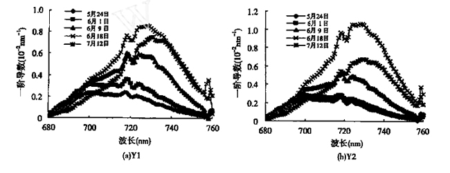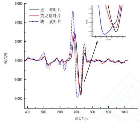 黃敬峰等對健康水稻和受病蟲害脅迫的水稻進行一階導數(shù)光譜和二階導數(shù)光譜分析研究,以期獲得不同數(shù)據(jù)形式的光譜敏感區(qū)域和敏感波段。研究表明,藍光450-515 nm、綠光550-590 nm、紅光650-690 nm和近紅外725-790 nm一階導數(shù)光譜對病蟲害脅迫敏感,其中以750 nm為中心的近紅外區(qū)域一屆倒數(shù)光譜變異最大;對于二階導數(shù)而言,在530 , 550 , 670 , 730 nm等4個吸收特征區(qū)域內,CRSSDR在各個區(qū)域內的變異較小,受害水稻葉片原始光譜二階導數(shù)的光譜在710-750 nm極小值遠小于健康葉片。