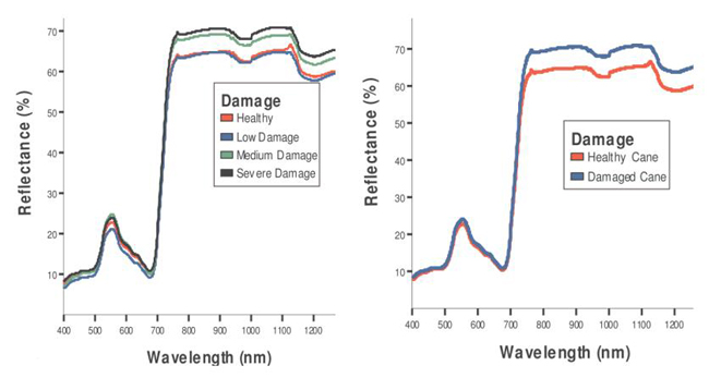 它是一種直接、簡單和快速的分析技術:它從傳感器直接獲得的數(shù)據(jù)人手,分析其轉化后的光譜反射率特征,獲取植被信息,具有普適性。如劉興庫等發(fā)現(xiàn)接種馬鈴薯奧古巴花葉病毒煙草早期的葉片在可見光部分與對照組無明顯試別,但在近紅外差別明顯。黃木易等對冬小麥條銹病光譜反射率特征進行深人研究后提出了冬小麥條銹病遙感監(jiān)測的敏感波段。MOKHELE等對甘蔗葉片進行不同程度的接種病害,研究發(fā)現(xiàn)不同程度的病害甘蔗葉片光譜差異顯著(如圖2所示)。然而他們的研究都較多地考慮了作物病害的光譜特性,而較少地考慮病害導致作物體內生理生化的變化,因此只能定性的分析其光譜特征。在今后的研究中若能將其光譜特征與不同發(fā)病程度及生理生化指標建立對應關系的話,可望實現(xiàn)病害的半量化或量化監(jiān)測。