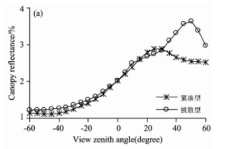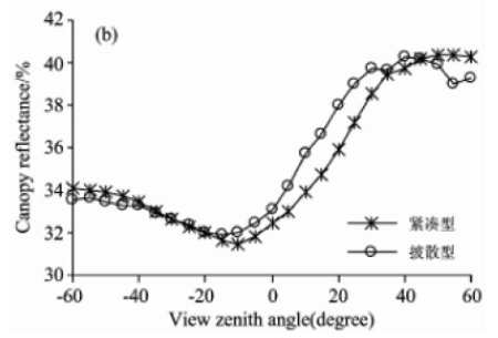 由圖中看出兩種株型小麥在后向散射區(qū)域存在熱點(diǎn)效應(yīng),并且紅光波段的熱點(diǎn)效應(yīng)比近紅外波段更顯著。紅光波段緊湊型和披散型小麥的熱點(diǎn)分別在后向散射區(qū)域20°附近和50°附近,近紅外波段緊湊型和披散型小麥的熱點(diǎn)角度大致在后向40°附近50°附近。這是由于紅光波段小麥植株葉綠素的強(qiáng)吸收增強(qiáng)了該波段的各向異性,而近紅外波段葉片多重散射效應(yīng)增強(qiáng),降低了植被在該波段的各向異性。另一方面,緊湊型小麥葉片主要集中在植株中上層,披散型小麥植株的上中下層均有葉片。且葉片披散程度比緊湊型小麥大,同一時(shí)期觀(guān)側(cè)視場(chǎng)內(nèi)不同株型小麥的植株信息和土壤信息比例不同。