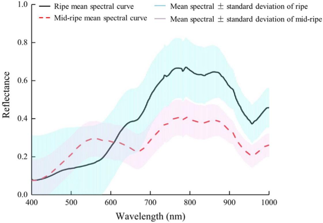 圖2 中熟和成熟的肥城桃子的平均光譜反射率與標準偏差