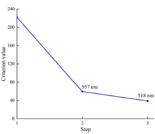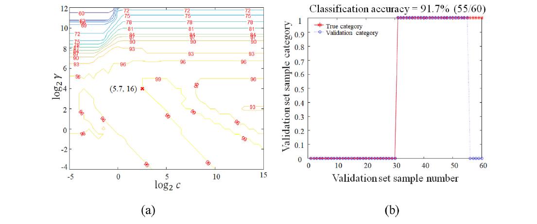在此基礎(chǔ)上,文章采用順序前向選擇(SFS)算法提取兩個有效波長(957nm,518nm),如圖4所示。隨后使用LIBSVM模型對肥城桃子的成熟度進行辨別,如圖5所示,圖5a為模型選取的最佳核參數(shù)C=5.7和γ=16,圖5b為模型分類識別的準確率,分類識別精度達到91.7%。