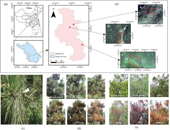 圖1 中國(guó)南京研究區(qū)域(a),三個(gè)林分(b),一個(gè)接種管(c),接種的Pinus thunbergii出現(xiàn)綠色攻擊、灰綠色攻擊、10%、50%、70%和100%變色的癥狀(d)和接種的馬尾松(e)的癥狀