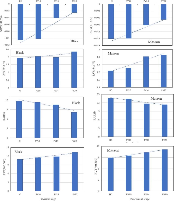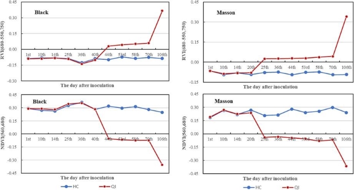 分析了自接種之日起RVI(680-550, 750)和NDVI(560, 680)的時(shí)間動(dòng)態(tài),在疾病進(jìn)展過程中,兩個(gè)指數(shù)的變化趨勢(shì)與非成像數(shù)據(jù)分析的結(jié)果一致。就兩個(gè)指數(shù)值的變化時(shí)間而言,馬尾松比黑松更快地進(jìn)入視覺上可辨別的變色階段。這種疾病的進(jìn)展與對(duì)接種樹木的實(shí)地調(diào)查結(jié)果一致。此外,與非成像數(shù)據(jù)分析的結(jié)果一致,這兩個(gè)指標(biāo)雖然表明區(qū)分了視覺前階段和視覺階段,但在視覺前階段,患病樹木和健康樹木之間的差異很小,使其不足以識(shí)別這一階段的患病樹木。