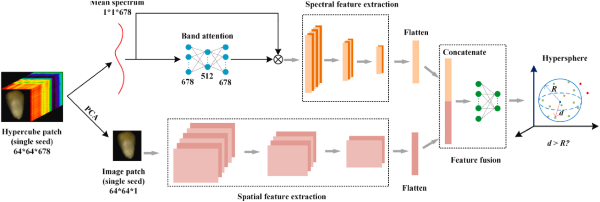 Zhang et al. (2024) 提出了一種基于高光譜成像和深度一類學(xué)習(xí)(OCL)的玉米種子欺詐檢測(cè)方法,旨在解決復(fù)雜開放場(chǎng)景下未知假品種的識(shí)別難題。通過(guò)融合高光譜數(shù)據(jù)的光譜與空間信息,結(jié)合波段注意力機(jī)制(BAM)抑制冗余波段干擾,構(gòu)建雙分支特征提取網(wǎng)絡(luò),并利用最小體積超球體學(xué)習(xí)策略實(shí)現(xiàn)真實(shí)品種的高效包裹與假品種的精準(zhǔn)拒絕。實(shí)驗(yàn)基于20個(gè)中國(guó)主栽玉米品種數(shù)據(jù)集,采用光譜(400.8-1000.7 nm)和降維后的單波段空間信息,模型在接收真實(shí)品種(ARK)和拒絕假品種(ARU)的準(zhǔn)確率分別達(dá)到93.70%和94.28%,AUC值為0.9399,顯著優(yōu)于傳統(tǒng)OCSVM、孤立森林及深度SVDD等方法。該方法通過(guò)端到端網(wǎng)絡(luò)架構(gòu)避免了復(fù)雜光譜預(yù)處理,結(jié)合信息融合與注意力機(jī)制提升了模型的穩(wěn)定性和解釋性,為種子質(zhì)量監(jiān)管及農(nóng)產(chǎn)品防偽提供了高效、無(wú)損的解決方案。