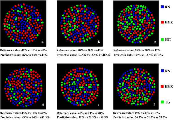 Huang et al. (2022) 該研究結(jié)合近紅外高光譜成像(HSI)與深度森林(DF)模型,開發(fā)了一種快速無(wú)損測(cè)定高粱純度的方法。通過(guò)孤立森林算法(IF)和主成分分析(PCA)剔除異常數(shù)據(jù)后,采用競(jìng)爭(zhēng)性自適應(yīng)重加權(quán)采樣(CARS)與連續(xù)投影算法(SPA)提取特征波長(zhǎng),并結(jié)合灰度共生矩陣(GLCM)獲取紋理特征?;诓煌瑪?shù)據(jù)類型(全光譜、特征光譜、紋理特征及融合數(shù)據(jù))構(gòu)建的DF模型中,特征光譜模型的性能最優(yōu),其平均正確識(shí)別率(CRR)超過(guò)91%,驗(yàn)證集I的平均CRR為88.89%。此外,模型在摻假比例檢測(cè)中預(yù)測(cè)偏差小于4%。研究證實(shí),HSI與DF的結(jié)合能夠高效區(qū)分高粱品種并精準(zhǔn)評(píng)估純度,為谷物質(zhì)量的無(wú)損檢測(cè)提供了新策略。高粱摻雜識(shí)別可視化如圖11所示。