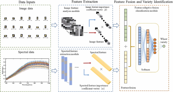 Han et al. (2024) 該研究開發(fā)了一種雙通道深度學(xué)習(xí)特征融合模型(DLFM),通過(guò)一維卷積模塊提取高光譜數(shù)據(jù)的光譜特征,二維卷積模塊提取RGB圖像的空間特征,并利用自適應(yīng)特征融合模塊實(shí)現(xiàn)多源數(shù)據(jù)融合(圖12)。實(shí)驗(yàn)表明,DLFM在三品種、四品種和五品種小麥組合中的識(shí)別準(zhǔn)確率分別達(dá)到99.18%、97.30%和93.18%,平均準(zhǔn)確率為92.87%,較傳統(tǒng)SVM、1DCNN和2DCNN模型提升顯著(最高提升12.54%)。驗(yàn)證集可視化顯示,模型能有效區(qū)分光譜和紋理特征相似的小麥品種,且預(yù)測(cè)誤差控制在10粒以內(nèi)。研究證實(shí),DLFM通過(guò)自適應(yīng)融合光譜與圖像特征,顯著提升了復(fù)雜混合場(chǎng)景下的分類穩(wěn)定性,為谷物品種快速無(wú)損識(shí)別提供了新方法。
