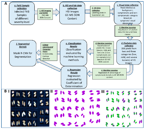 Dhakal et al. (2023) 基于高光譜成像(HSI)與機(jī)器學(xué)習(xí)方法,提出了一種小麥籽粒赤霉?。‵HB)損傷及其毒素脫氧雪腐鐮刀菌烯醇(DON)含量的無(wú)損檢測(cè)技術(shù)。通過(guò)對(duì)129個(gè)小麥品種的田間試驗(yàn)樣本(DON含量通過(guò)GC-MS測(cè)定)進(jìn)行高光譜數(shù)據(jù)采集,結(jié)合集成學(xué)習(xí)算法G-Boost和深度學(xué)習(xí)模型Mask R-CNN,實(shí)現(xiàn)了小麥籽粒損傷分類與DON含量的關(guān)聯(lián)分析(圖15)。結(jié)果表明,G-Boost在光譜特征分類中表現(xiàn)最優(yōu),訓(xùn)練集準(zhǔn)確率達(dá)97%,可有效區(qū)分健康、低DON(<0.5 ppm)與高DON(>1.5 ppm)籽粒;Mask R-CNN在實(shí)例分割中平均精度(mAP)達(dá)0.97,結(jié)合閾值法(70%病斑像素判定為病粒)后,DON含量與病粒數(shù)量回歸分析的決定系數(shù)(R²)提升至0.75。該研究驗(yàn)證了高光譜成像結(jié)合多模態(tài)機(jī)器學(xué)習(xí)模型在農(nóng)業(yè)毒素在線檢測(cè)中的潛力,為糧食加工環(huán)節(jié)的快速質(zhì)量評(píng)估提供了技術(shù)參考。