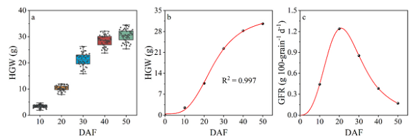 圖?3 玉米籽粒灌漿動力學過程。(a) 不同灌漿階段百粒重(HGW)統(tǒng)計;(b) HGW 生長動力學曲線擬合;(c) 開花后灌漿速率(GFR)變化。