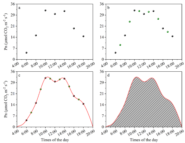 圖?4 Pn 擬合曲線投影面積獲取流程。(a) 開花后第?10?天的凈光合速率(Pn)測值;(b) 數(shù)據(jù)插值處理;(c) Pn 曲線擬合;(d) 曲線下投影面積計算。
