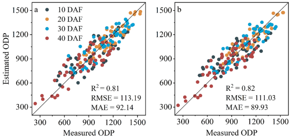 通過實測和估算的ODP數(shù)據(jù)對最終產(chǎn)量進行了估測(圖?9)。僅使用開花后10?天(10?DAF)實測和估算ODP進行產(chǎn)量估算時,決定系數(shù)R²分別僅為0.526和0.393,準確性較低;當加入開花后20?天(20?DAF)的ODP數(shù)據(jù)后,R²分別提升了0.182和0.194,估測精度顯著提高;而在繼續(xù)加入30?DAF和40?DAF數(shù)據(jù)時,R²的最大增幅均不足0.13。綜合使用四個時點的ODP實測值進行回歸,可獲得R²?=?0.770,RMSE?=?0.961?t?ha?¹,MAE?=?0.816?t?ha?¹,表明多時點ODP實測數(shù)據(jù)可較準確地估測玉米產(chǎn)量。使用估算的ODP值進行產(chǎn)量估測時,R²亦均超過0.70,說明ODP估算同樣可用于精度較高的產(chǎn)量預測。
