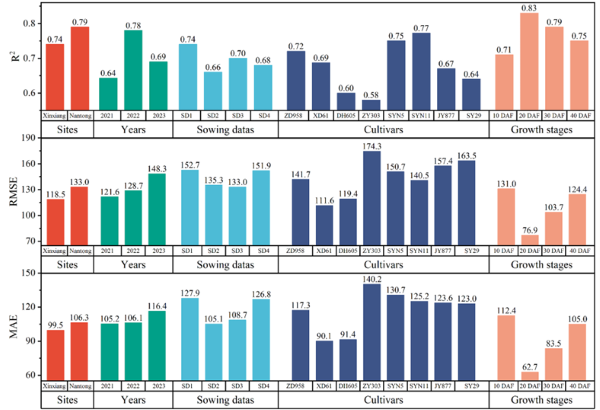 圖11 不同試驗地點、年份、播期、品種及生育階段對 ODP 估算精度的影響。其中,ZD?958 表示鄭單?958,XD?61 表示新單?61,DH?605 表示登海?605,ZY?303 表示中育?303,SYN?5 表示蘇育?5,SYN?11 表示蘇育?11,JY?877 表示江育?877,SY?29 表示蘇玉?29。