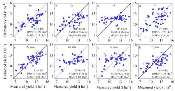 圖?12. 基于不同光合指標的產(chǎn)量估測對比。(a–d) 未引入投影面積指標;(e–h) 引入投影面積指標后。