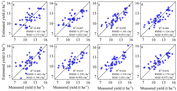 圖13 基于植被指數(shù)的產(chǎn)量估測對比。(a–d) 采用表?4中篩選的VIs;(e–h) 基于VIs與產(chǎn)量相關性篩選后的估測結果。(a) 僅10?DAF篩選VIs;(b) 10DAF?+?20DAF 篩選VIs;(c) 10、20、30?DAF篩選VIs;(d) 10、20、30、40?DAF篩選VIs;(e) 僅10?DAF相關性篩選;(f) 10?DAF?+?20?DAF相關性篩選;(g) 10、20、30?DAF 相關性篩選;(h) 10、20、30、40?DAF相關性篩選。