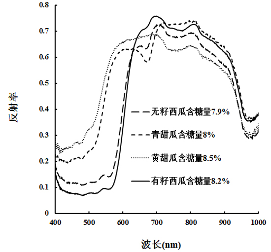 本研究通過分析不同品種的西瓜、甜瓜的光譜曲線可知,對于不同品種的西瓜而言,其光譜曲線總體變化趨勢相似,在550 nm、700 nm、800 nm附近有吸收峰,在570-650 nm 紅光區(qū)域反射率呈直線上升,形成陡坡,因此570-650 nm波段范圍與550 nm、700 nm、800 nm三個波段都可以作為西瓜瓜瓤的特征波段。對于不同品種的甜瓜,在400-550 nm范圍內(nèi),黃色甜瓜的光譜反射率顯著高于青色甜瓜,甜瓜在700 nm、800 nm附近也有吸收峰;在500-600 nm 范圍內(nèi)反射率呈直線上升,形成陡坡,因此500-600 nm波段范圍與700 nm、800 nm兩個波段都可以作為甜瓜的特征波段。比較相似糖度下的西瓜和甜瓜的光譜曲線可知,兩種水果都陡坡形成,只是陡坡形成的位置有所差異,甜瓜的光譜曲線陡坡在500-600 nm附近,西瓜的光譜曲線陡坡在570-650 nm附近;在700 nm和800 nm附近均有吸收峰,在720-1000 nm范圍內(nèi),不同品種的西瓜、甜瓜光譜反射率曲線變化趨勢相似。