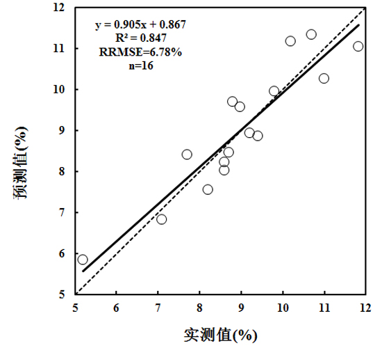 運用獨立的數(shù)據(jù)對該線性模型y=30.941x-11.05進行檢驗,如圖10所示,其實測值與預(yù)測值之間的決定系數(shù)R2為0.847,斜率Slope為0.905,截距為0.867,相對均方根誤差為6.78%。結(jié)果表明由639.3 nm處的光譜反射率與其糖度構(gòu)建的一次線性模型對于西瓜、甜瓜等糖度的預(yù)測具有較好的效果。