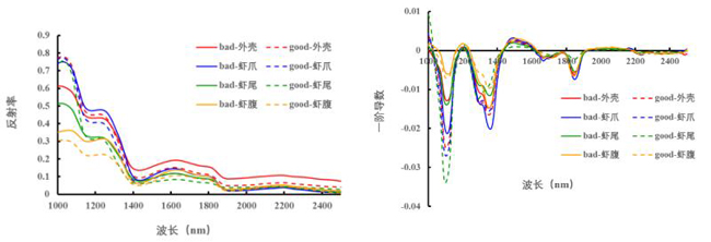 與可見、近紅外高光譜成像技術(shù)分析小龍蝦光譜一樣,在短波紅外的高光譜圖像上分別選取小龍蝦身上不同部分約200個(gè)像素點(diǎn)取均值代表小龍蝦該部分的光譜反射率,如圖4所示,分別列舉了品質(zhì)好的和壞的小龍蝦外殼、蝦爪、蝦尾和蝦腹在短波紅外范圍的光譜進(jìn)行分析,并對(duì)原始光譜作了一階導(dǎo)數(shù)分析,目的是為了更加深入地了解不同品質(zhì)的小龍蝦其不同部位的光譜差異。圖4 左為短波紅外1000-2500nm的光譜反射率曲線圖,從圖中可知,在短波紅外范圍,不同品質(zhì)的小龍蝦及小龍蝦的不同部位光譜反射率曲線變化趨勢相似,不同的是曲線反射率的高低及峰谷的高低。圖4右為不同品質(zhì)小龍蝦及不同部位在短波紅外范圍的一階導(dǎo)數(shù)光譜曲線。從圖中可知,不同品質(zhì)的小龍蝦,其峰谷位置及峰谷的值差異較大,小龍蝦不同部位之間的光譜也有顯著差異。