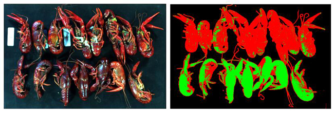 利用可見近紅外以及短波紅外高光譜成像技術(shù)對(duì)成熟的小龍蝦進(jìn)行品質(zhì)分析,研究不同品質(zhì)小龍蝦的光譜差異并通過高光譜成像技術(shù)快速識(shí)別不同品質(zhì)的小龍蝦,為餐飲行業(yè)行業(yè)快速識(shí)別不同品質(zhì)小龍蝦提供技術(shù)支持。圖2為需要利用高光譜成像設(shè)備采集分析的小龍蝦樣本,左邊為品質(zhì)好的小龍蝦,右邊為品質(zhì)壞的小龍蝦。