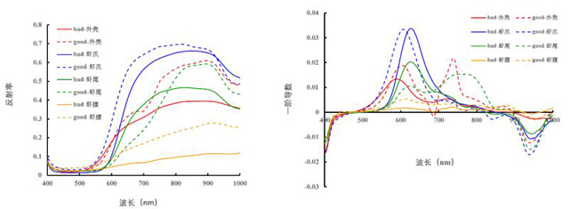 在小龍蝦身上不同部分分別選取約200個(gè)像素點(diǎn)取均值代表小龍蝦該部分的光譜反射率,如圖3所示,分別列舉了品質(zhì)好的和壞的小龍蝦外殼、蝦爪、蝦尾和蝦腹在可見近紅外波長范圍的光譜進(jìn)行分析,并對(duì)原始光譜作了一階導(dǎo)數(shù)分析,目的是為了更加深入地了解不同品質(zhì)的小龍蝦其不同部位的光譜差異。圖3左為品質(zhì)好的與壞的小龍蝦不同部位的原始光譜反射率曲線,從圖中可知,小龍蝦不同部位的光譜反射率在400-530nm之前差異較小,但在530nm之后小龍蝦不同部位的光譜曲線差異較大。對(duì)于品質(zhì)壞的小龍蝦,其外殼光譜的陡坡位置相對(duì)于品質(zhì)好的小龍蝦而言,發(fā)生了“藍(lán)移”;另外品質(zhì)壞的小龍蝦,其蝦爪、蝦尾、蝦腹等部位與品質(zhì)好的小龍蝦,其光譜反射率差異也較大。圖3右更能清晰地看出不同品質(zhì)的小龍蝦不同部位的光譜差異及品質(zhì)好與品質(zhì)差的小龍蝦在400-1000nm范圍內(nèi)的光譜差異,從其峰谷位置及峰谷的高低,很顯著地看出品質(zhì)好與品質(zhì)差的小龍蝦的光譜差異。