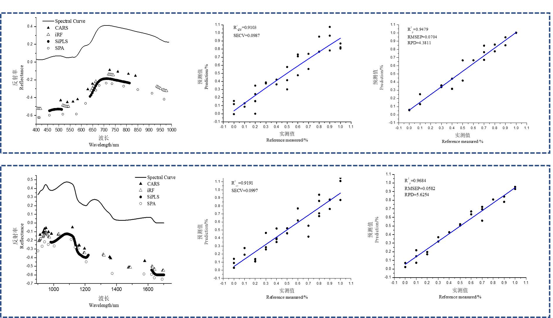 首先對全光譜進行預處理后建模,如表1,表2所示,對于400~1000nm波段范圍的光譜,采用歸一化預處理后建模效果最好,對于900~1700nm波段范圍的光譜,采用SNV預處理后的光譜建模最好。