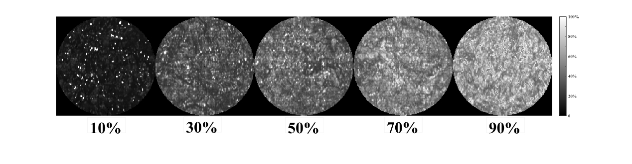 最后對最佳模型進行可視化反演,從圖3可以看出,隨著摻假比例的增加,顏色由深色變成淺色。高光譜成像技術提供了一種切實可靠的方法來可視化摻假樣品的分布,這是其他方法無法實現(xiàn)的。