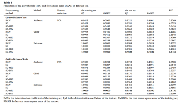 本研究通過(guò)化學(xué)計(jì)量學(xué)方法確定了藏茶中的TPs和FAAs,并通過(guò)高光譜成像(HSI)和多變量分析對(duì)其進(jìn)行了預(yù)測(cè)。結(jié)果表明,藏茶中的TPs和FAAs含量存在顯著差異(p < 0.05)。研究表明,HSI能夠?qū)崿F(xiàn)茶葉質(zhì)量參數(shù)的非破壞性檢測(cè)。本研究將茶葉檢測(cè)從外部特征的評(píng)估轉(zhuǎn)變?yōu)橥獠亢蛢?nèi)部特征的綜合評(píng)估,這將有助于提高藏茶行業(yè)的檢測(cè)效率,促進(jìn)雅安藏茶產(chǎn)業(yè)的發(fā)展,推動(dòng)藏茶經(jīng)濟(jì)的增長(zhǎng),并為其他食品領(lǐng)域提供一種快速、非破壞性的檢測(cè)方法。