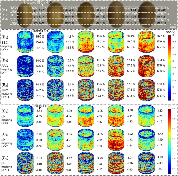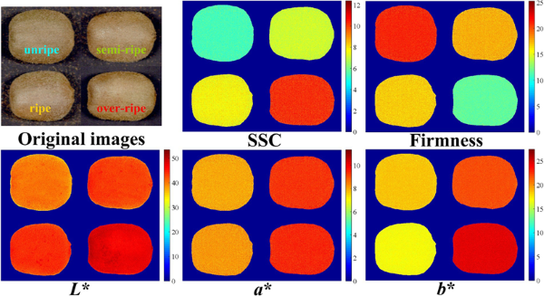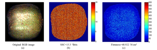 圖2.原始RGB圖像(a)和獼猴桃中SSC(B)和硬度(c)的分布圖(測量值在圖的底部)。