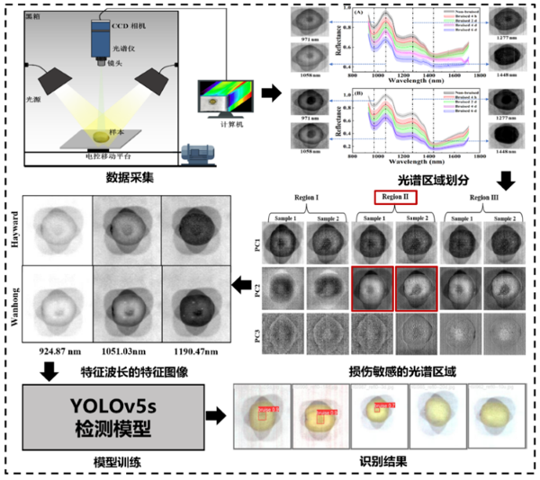 獼猴桃在采收、運輸和儲存過程中,果肉常因碰撞或擠壓而碰傷。然而,獼猴桃身上的傷痕肉眼極難識別,被稱為隱性損傷。Bu et al. (2024)利用高光譜成像(HSI)與深度學習相結(jié)合的方法檢測了獼猴桃中隱性損傷(圖8)。該研究使用主成分分析 (PCA) 選擇對獼猴桃隱藏損傷敏感的光譜范圍 (924–1277 nm) 和特征波長(928.19、1051.03和1190.47 nm)。隨后,根據(jù)獼猴桃特征波長圖像生成三通道圖像、灰度圖像和偽彩色圖像,并用于開發(fā)檢測獼猴桃隱藏的瘀傷區(qū)域的 深度學習模型。研究結(jié)果表明,深度學習模型HSI技術結(jié)合深度學習模型可以有效檢測獼猴桃中的隱藏碰傷。