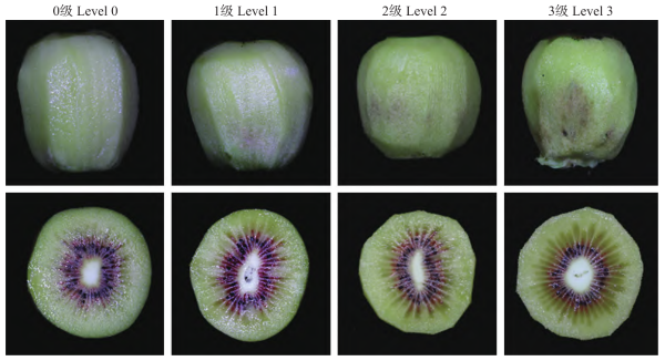 結(jié)合獼猴桃出庫后的商業(yè)價值,將冷害分為4個等級,判別標準如下:0級為正常(未發(fā)生冷害);1級為極輕(0<可見病癥≤1/4),不影響果實銷售,仍具有商業(yè)價值;2級為較輕(1/4<可見病癥≤1/2),失去部分商業(yè)價值,影響果實銷售;3級為嚴重(1/2≤可見病癥),不可食用,徹底失去商業(yè)價值。