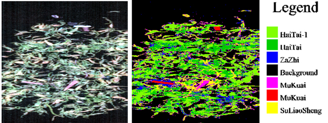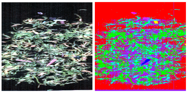 圖7為決策樹(shù)的分叉圖,主要運(yùn)用了MNF變化的MNF2、3、4、5波段,以及高光譜圖像數(shù)據(jù)的第15、80、104波段做決策樹(shù)分類,該閾值是運(yùn)用最大類間方差法獲取。圖8為利用該決策樹(shù)的分類效果圖,從圖中可知,原圖無(wú)法用肉眼識(shí)別的塑料繩、雜質(zhì)等,運(yùn)用決策樹(shù)分類后能較為清晰的識(shí)別出來(lái),而且圖像處理速度大大提高。