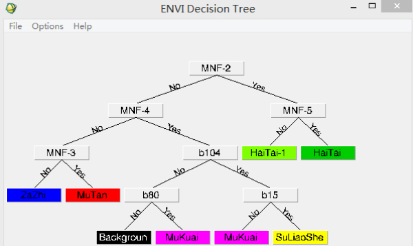 根據(jù)2和3可知,運(yùn)用MNF和監(jiān)督分類方法雖然能較好地識(shí)別出海苔,但是單個(gè)MNF波段只能識(shí)別出少量的雜質(zhì),且位置雜質(zhì)屬性,監(jiān)督分類雖然能識(shí)別較多的雜質(zhì),但是需要選擇訓(xùn)練樣本,且運(yùn)行時(shí)間較長(zhǎng),并不適合未來(lái)產(chǎn)業(yè)化的發(fā)展。因?yàn)楸狙芯刻接懢C合使用不同物質(zhì)的光譜特征及其MNF波段,運(yùn)用決策樹(shù)分類方法快速識(shí)別海苔、雜質(zhì)、背景。