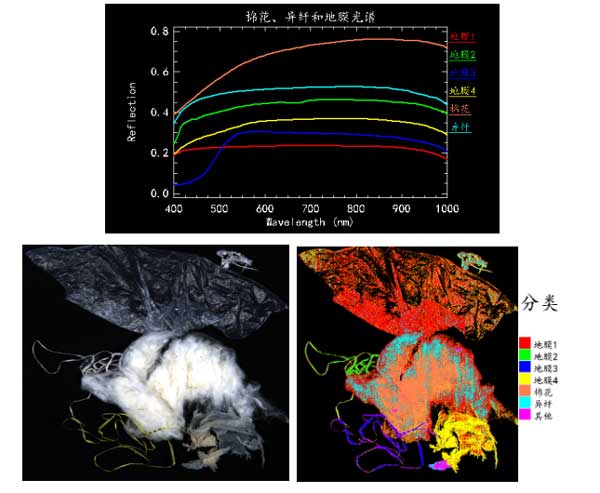圖3為棉花與各種不同地膜在400-1000nm波長范圍內(nèi)的光譜反射率曲線,從其反射率曲線來看,棉花的光譜反射率最高,其他依次是異纖、地膜2、地膜4、地膜1或地膜3。棉花的光譜反射率與地膜1、地膜2、地膜4和異纖的光譜反射率變化趨勢(shì)相似,地膜3在400-550nm之間與棉花的光譜反射率相差較大。因此在光譜判別的過程中,棉花可能會(huì)存在錯(cuò)分為地膜1、地膜2、地膜4以及異纖的可能。圖3下圖為利用400-1000nm光譜范圍對(duì)棉花、地膜和異纖的分類研究,從分類結(jié)果來看,邊緣部分棉花被錯(cuò)分為地膜1,中間部分棉花有一些被錯(cuò)分為異纖,而地膜2、地膜3和地膜4有較好的區(qū)分度。