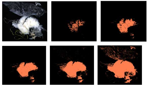 同樣,我們運(yùn)用光譜角匹配算法對(duì)圖像、的棉花快速判別,下圖為不同光譜匹配角下棉花的判別效果圖(從左到右匹配角分別是0.04、0.08、0.1)。從判別效果來看,在匹配角為0.04的情況下存在少量的異纖被錯(cuò)分為棉花,但很多棉花卻沒有被判別出來;在匹配角是0.08和0.1的情況下,雖然大部分棉花被識(shí)別出來,但是更多的異纖則被錯(cuò)誤的判為棉花。另外利用光譜角匹配算法判別棉花,四種不同的地膜沒有被判別為棉花,這是因?yàn)檫@四種地膜在短波紅外范圍內(nèi),其光譜曲線變化趨勢(shì)與棉花不同,但異纖的光譜曲線變化趨勢(shì)與棉花相近,由此可見光譜匹配角比較適合于不同種類的目標(biāo)物的判別,則光譜曲線變化趨勢(shì)不能一致。