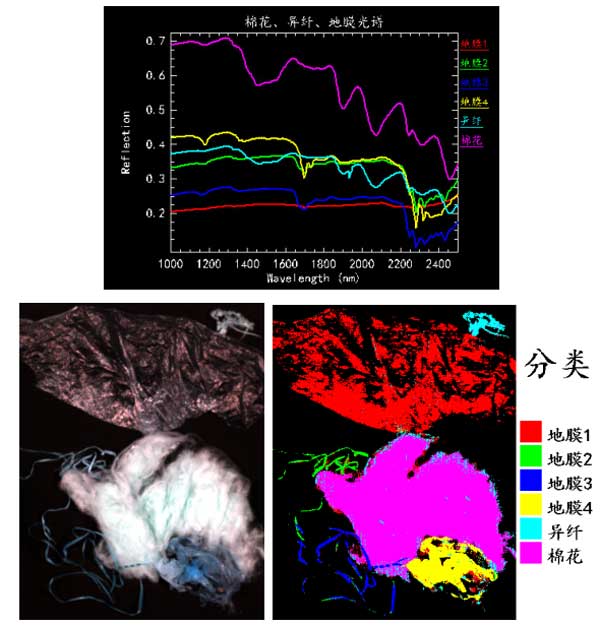 圖5為棉花以及地膜在短波紅外1000-2500nm波長范圍內(nèi)的光譜反射率曲線,從其反射率曲線來看,在短波紅外范圍內(nèi),棉花的光譜反射率曲線高于地膜及異纖的光譜反射曲線;從光譜曲線變化趨勢(shì)來看,除了異纖的光譜反射曲線變化趨勢(shì)與棉花的光譜反射曲線相似外,其他地膜的光譜反射曲線與棉花的光譜反射曲線相差較大;地膜2、地膜3和地膜4在1700nm和2300nm附近有較為明顯的吸收峰,而棉花則沒有,因此可以除了根據(jù)反射率值的高低區(qū)分棉花和地膜外,也可以根據(jù)這兩個(gè)吸收峰來辨別棉花和地膜;地膜1在短波紅外范圍內(nèi),其反射率值無顯著變化,基本上是一條很水平的直線。圖5下為利用1000-2500nm光譜范圍對(duì)棉花、地膜以及異纖的分類研究,從分類結(jié)果來看,不同的地膜之間有很好的區(qū)分度,能較好地區(qū)分出不同的地膜,棉花的辨別除了少量異常點(diǎn)以及邊緣的棉花可能受背景因素的干擾被錯(cuò)分為異纖外大部分棉花可以正常判別,達(dá)到了較為理想的判別效果,而異纖則不存在被錯(cuò)分為棉花。