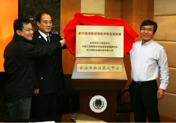 2014年10月14日,由公安部物證鑒定中心、中國(guó)工程物理研究院流體物理研究所(以下簡(jiǎn)稱物理所)、四川雙利合譜科技有限公司(以下簡(jiǎn)稱雙利合譜)聯(lián)合成立的“多光譜成像偵查技術(shù)聯(lián)合實(shí)驗(yàn)室”,在公安部物證鑒定中心舉行了隆重的揭牌儀式。公安部物證鑒定中心葛百川、季安全、許小京,中國(guó)工程物理研究院流體物理研究所杜紹雄、趙劍衡,四川雙利合譜科技有限公司丁良成、張志濤等20余人出席了開(kāi)幕典禮。