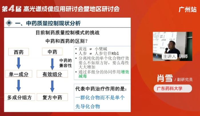 廣東藥科大學(xué)肖雪副研究員為大家?guī)怼督t外光譜技術(shù)助力中藥質(zhì)量控制:從離線走向在線》的報(bào)告。報(bào)告首先簡(jiǎn)介了中藥質(zhì)量控制與生產(chǎn)流程現(xiàn)狀及發(fā)展趨勢(shì),介紹了中藥生產(chǎn)過程智能控制系統(tǒng)的軟硬件組成,基于生產(chǎn)全過程“原料-中間體-制劑”展示了近紅外光譜快檢的應(yīng)用案例,最后針對(duì)近紅外光譜技術(shù)的應(yīng)用提出了一些思考。