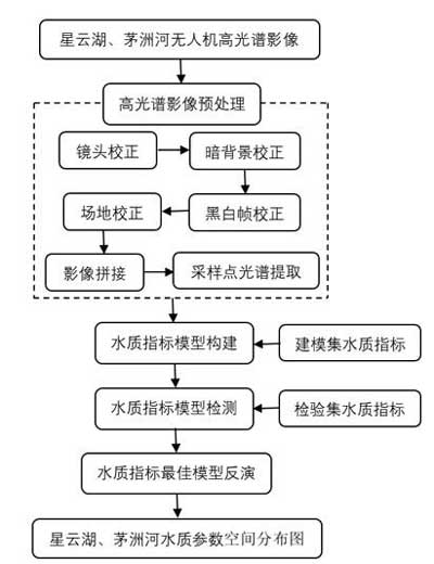 本研究以云南玉溪市星云湖和深圳市茅洲河為研究區(qū),利用無(wú)人機(jī)高光譜技術(shù)構(gòu)建水質(zhì)參數(shù)如總氮、總磷、懸浮物、濁度、葉綠素a的監(jiān)測(cè)模型,將最優(yōu)的監(jiān)測(cè)模型反演到無(wú)人機(jī)高光譜影像上制作總氮、總磷、懸浮物、濁度、葉綠素a的空間分布圖。具體計(jì)算路線如圖2所示。