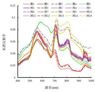 圖3為星云湖和茅洲河共20個(gè)采樣點(diǎn)的光譜反射率曲線,其中星云湖的5個(gè)采樣點(diǎn)簡(jiǎn)稱湖+數(shù)字,茅洲河的15個(gè)采樣點(diǎn)簡(jiǎn)稱河+數(shù)字。從圖可以看出水體的光譜特征變化:在400-590nm范圍內(nèi),水體的光譜反射率呈上升趨勢(shì),在570-590nm附近形成一個(gè)反射峰,是由葉綠素和胡蘿卜素吸收較弱以及水中藻類和懸浮物的散射作用形成的;在590-680nm范圍內(nèi),水體的光譜反射率曲線呈下降趨勢(shì),在670-680nm范圍內(nèi)形成一個(gè)峰谷,這是由于葉綠素a的強(qiáng)吸收引起的;在690-710nm范圍內(nèi)形成的陡峰可作為水體有無(wú)葉綠素的重要依據(jù),由于浮游植物色素的熒光效應(yīng),使得水和葉綠素 a的吸收系數(shù)之和在此波長(zhǎng)處達(dá)到最小值;在790-810nm范圍內(nèi)形成的峰值是由于水中懸浮物的散射作用引起的。綜合分析星云湖和茅洲河采樣點(diǎn)的光譜曲線可知,不同區(qū)域、不同水質(zhì)的光譜曲線變化趨勢(shì)總體一致,是不同采樣點(diǎn)由于所含的水質(zhì)參數(shù)含量不同,其峰谷值及曲線高低變換緩慢不同。