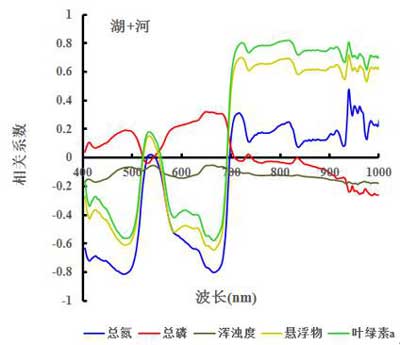 將星云湖和茅洲河采樣點(diǎn)的水質(zhì)參數(shù)(如總氮、總磷、懸浮物、濁度和葉綠素a)分別與其對(duì)應(yīng)的光譜反射率值進(jìn)行相關(guān)性分析,得到如圖4所示的相關(guān)性曲線。從圖4可知,在400-1000nm光譜范圍內(nèi),濁度與各波段的反射率始終呈負(fù)相關(guān)關(guān)系,且相關(guān)系數(shù)并不高,相關(guān)系數(shù)絕對(duì)值在0-0.2之間;總磷與各波段的反射率呈正負(fù)相關(guān)性,相關(guān)系數(shù)絕對(duì)值最高的在660-690nm之間;總氮與各波段的反射率在400-530nm和540-695nm處呈負(fù)相關(guān)關(guān)系,在530-540和695-1000nm處呈正相關(guān),相關(guān)系數(shù)在490nm和690nm附近有兩個(gè)峰值;懸浮物和葉綠素a與各波段反射率相關(guān)性變化趨勢(shì)一致,在400-690nm范圍內(nèi)呈正負(fù)相關(guān)性,在690-1000nm范圍內(nèi)呈正相關(guān)性,相關(guān)系數(shù)在490nm和690nm附近有兩個(gè)峰值,在690-1000nm范圍內(nèi)保持較高的相關(guān)性。