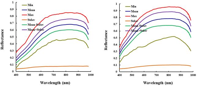 圖3 新會2013年(左圖)和2014年(右圖)陳皮外層高光譜反射率(400 nm-1000nm)