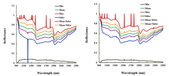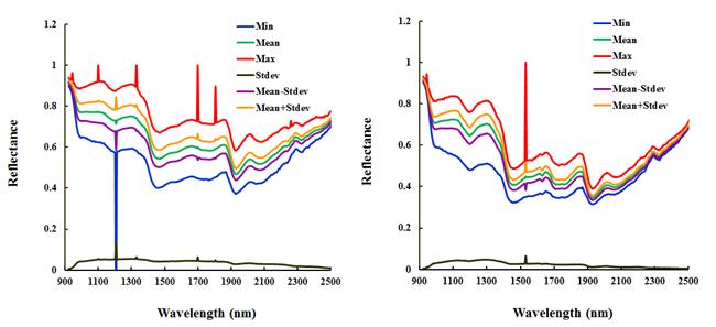 圖4新會2013年(左圖)和2014年(右圖)陳皮里層高光譜(1000 nm-2500 nm)