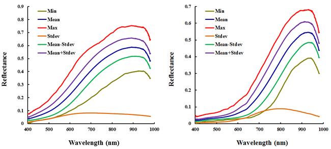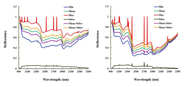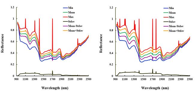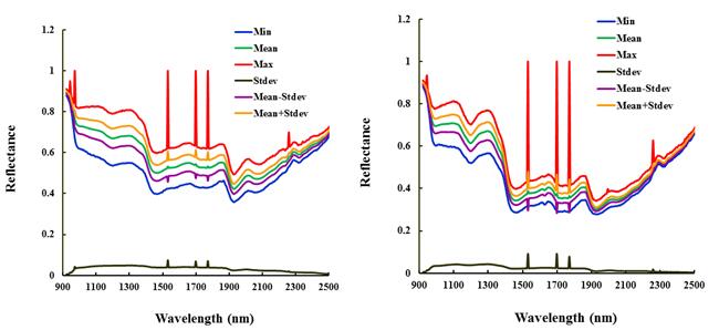 圖4和圖5為新會2013年和2014年陳皮里外層部分在1000 nm-2500nm范圍內(nèi)的光譜反射率的最大值、最小值、均值、方差、均值±方差曲線。
