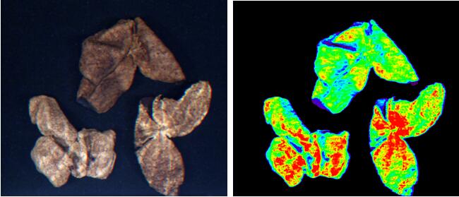 圖9為不同產(chǎn)地不同年份陳皮里層的RGB合成圖(R:640 nm,G:550 nm,B:460 nm)和主成分分析的第一主成分的分類圖。其中圖9(a)為1991年江門市陳皮內(nèi)層的RGB合成圖和主成分分析的第一主成分的分類圖,圖9(b)為2002年某市陳皮內(nèi)層的RGB合成圖和主成分分析的第一主成分的分類圖,從這兩圖可知紅色區(qū)域?yàn)闊o霉斑區(qū)域,藍(lán)色區(qū)域和綠色區(qū)域?yàn)槊拱邊^(qū)域。圖9(c)2014年新會市陳皮內(nèi)層的分類圖可知,紅色區(qū)域和綠色區(qū)域?yàn)闊o霉斑區(qū)域,藍(lán)色區(qū)域?yàn)槊拱邊^(qū)域。