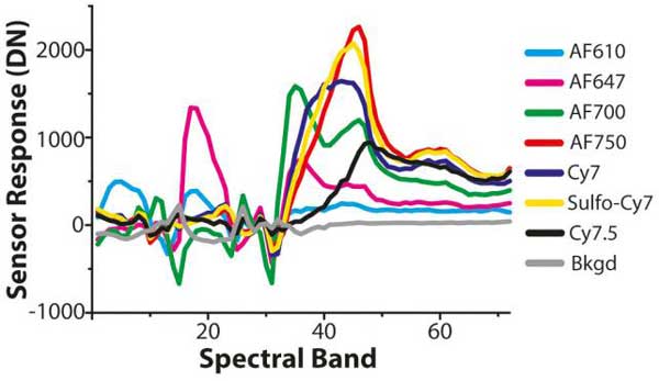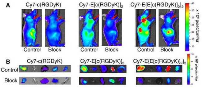 對(duì)于一些需化學(xué)方法進(jìn)行標(biāo)記的物質(zhì),比如化學(xué)合成藥物、納米藥物及一些肽段等,只能通過化學(xué)合成的方法與熒光染料進(jìn)行偶連,檢測(cè)熒光的發(fā)光情況,從而實(shí)現(xiàn)活體示蹤的目的。目前應(yīng)用較多的是對(duì)于一些腫瘤靶向藥物在活體內(nèi)靶點(diǎn)的識(shí)別、研究蛋白質(zhì)-蛋白質(zhì)相互作用以及跟蹤化學(xué)藥物在體內(nèi)的分布及代謝情況等。例如用CY5.5及CY7標(biāo)記RGD肽段,研究其在尾靜脈注射不同時(shí)間里對(duì)移植膠質(zhì)瘤中細(xì)胞粘附分子Intergrin的特異性識(shí)別過程。在腫瘤藥物相關(guān)研究中,用CY5.5標(biāo)記兩種脫氧核糖類似物CY5.5-2DG及CY5.5-NHS均可在小鼠活體水平上直接觀測(cè)到其對(duì)腫瘤的特異性識(shí)別作用。