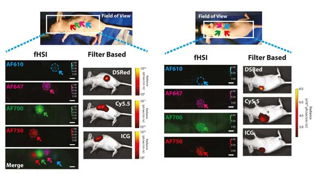 圖2A 麻醉裸鼠四種染料試制的分布/ 圖2B 四種染料試制混合注射到裸鼠體內(nèi)觀測(cè)試制分布