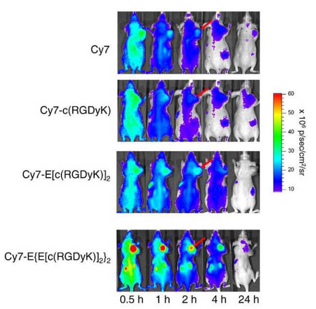 圖3 注射500 pmol Cy7、Cy7-c(RGDyK)、Cy7-E[c(RGDyK)]2、 or Cy7-E{E[c(RGDyK)]2}2的皮下U87MG腫瘤小鼠在2min、30min、1h、2h、4h、24h時(shí)間內(nèi)的全身NIR熒光成像