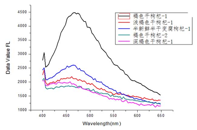 1、干枸杞熒光信號也分布在455nm附近,與新鮮枸杞比較,在550nm附近沒有波峰,而且整個光譜都隨著新鮮的程度其光譜曲線逐漸下降;