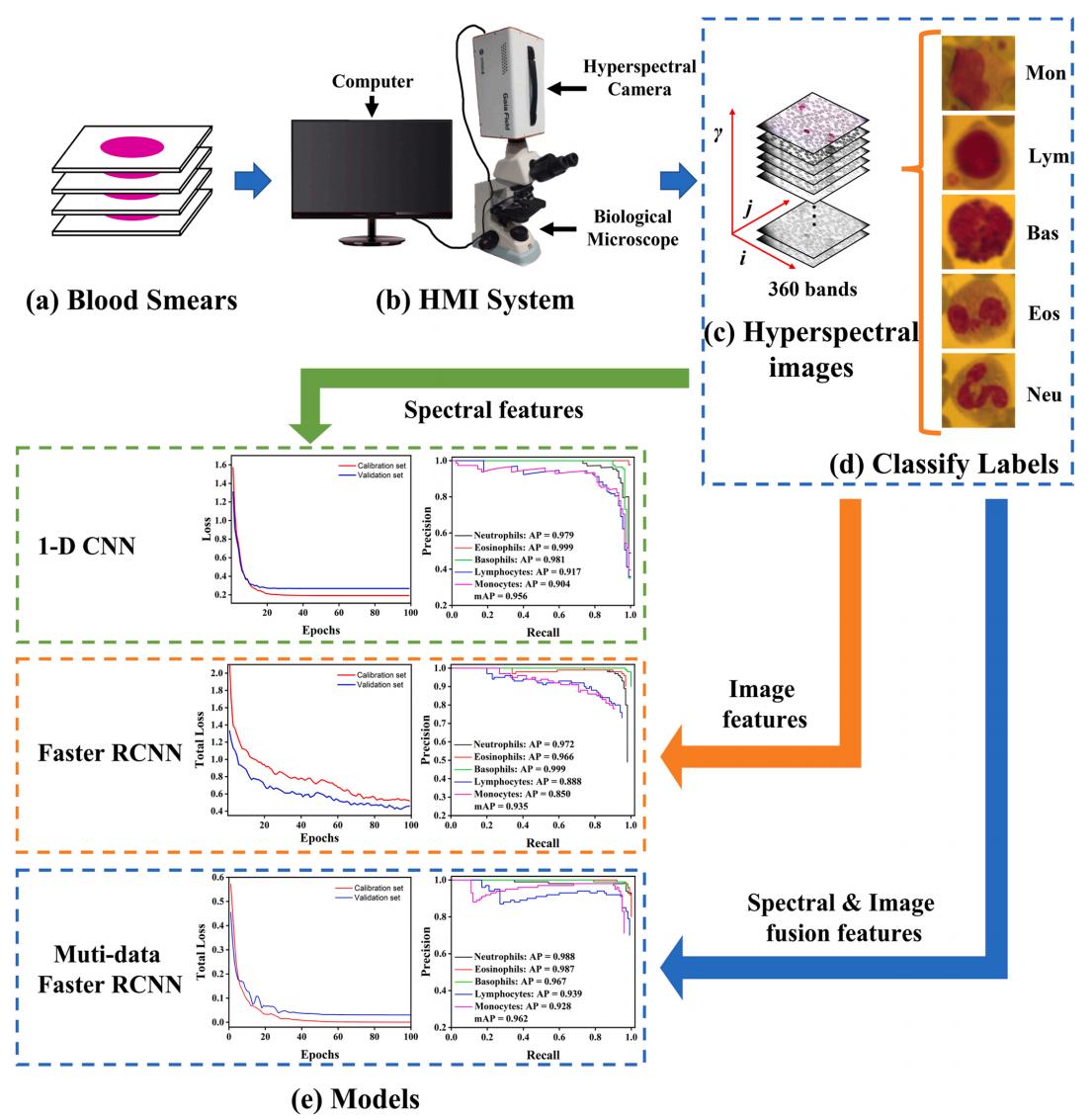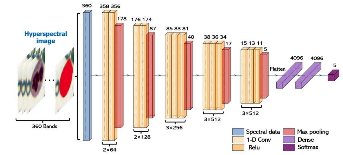 具體研究內(nèi)容如下:(1)利用高光譜顯微成像(Hyperspectral microscopic imaging, HMI)系統(tǒng)獲取血液涂片中含有白細胞區(qū)域的影像,并對每種類型的白細胞進行標記,形成五種分類的數(shù)據(jù)集。(2)根據(jù)VGG16網(wǎng)絡(luò)架構(gòu)構(gòu)建一維CNN網(wǎng)絡(luò),并基于WBC的光譜數(shù)據(jù)進行相應(yīng)的訓(xùn)練和預(yù)測,驗證光譜數(shù)據(jù)作為WBC分類依據(jù)的可行性。(3)與一維CNN相似,采用Faster RCNN作為對照組,基于偽彩色圖像對WBC進行識別分類,觀察基于單一數(shù)據(jù)的分類準確率。(4)最后,構(gòu)建了基于圖像和光譜特征的多數(shù)據(jù)Faster RCNN深度學習模型,并探討多數(shù)據(jù)聯(lián)合在白細胞檢測中的可行性和優(yōu)勢。