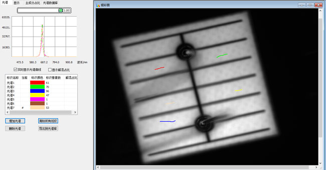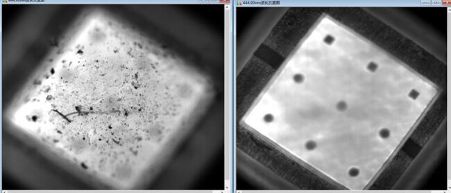 利用顯微高光譜系統(tǒng)在10X倍的物鏡下能夠觀察到LED光源上的微觀構(gòu)造,并且能夠準(zhǔn)確的測試到不同led光源對應(yīng)的特征波長,而且圖像也非常的清晰(實際測試時樣品并非完全平整),通過焦距調(diào)試,能夠凸顯出光源自身的一些特征信息。